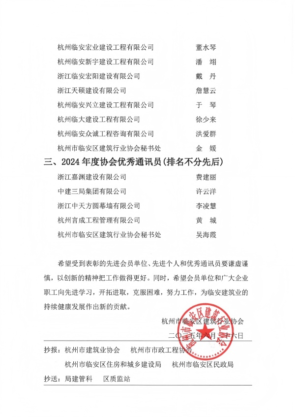 杭州市临安区建筑行业协会2024年度协会先进会员单位